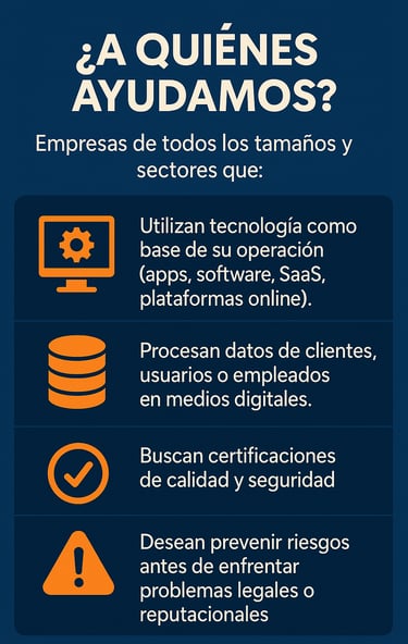 Asesoramos a empresas para que sus procesos, plataformas y tecnologías cumplan con las regulaciones vigentes, reduciendo riesgos legales, fortaleciendo su reputación y protegiendo la confianza de sus clientes.